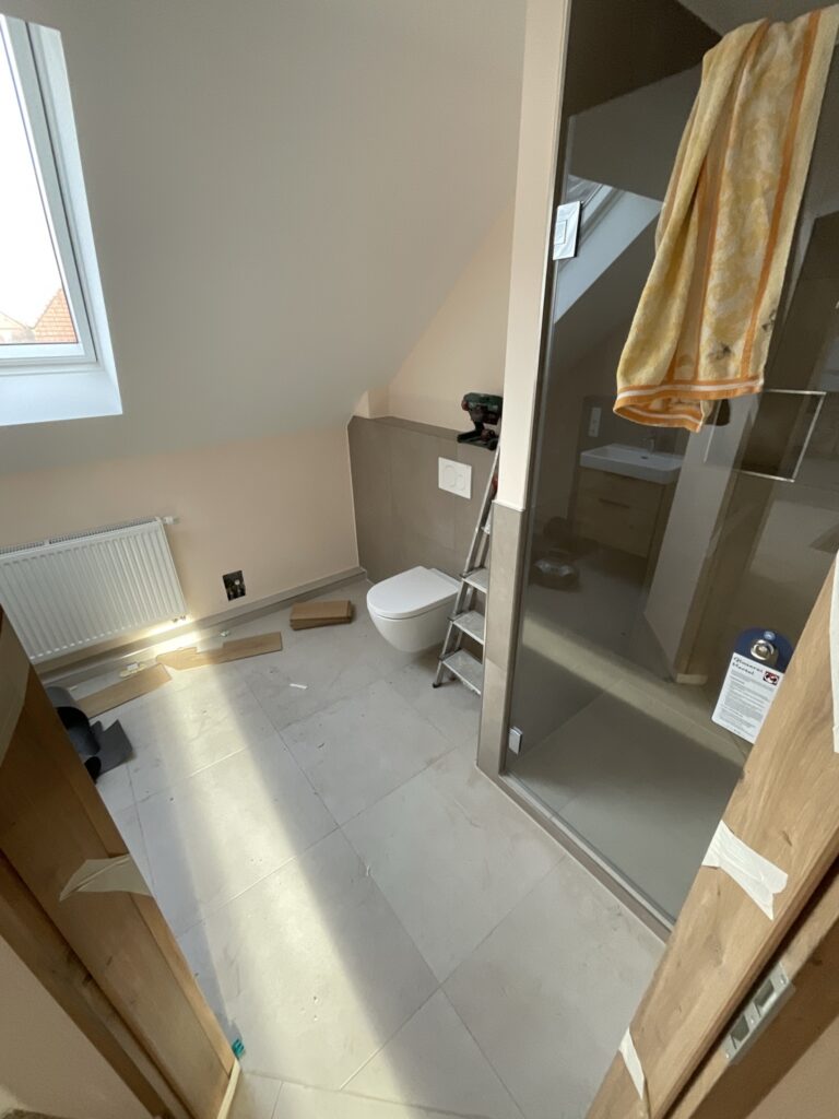 - Es wird eine neue Treppe vom DG in den Spitzboden führen. Dafür wurde das WC im DG zurückgebaut. Und ein neues Bad entsteht im Spitzboden, direkt neben dem Jugendzimmer – praktisch!